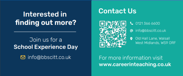 Barr Beacon in partnership with Ryders Hayes School. Here you can train to do a School Centred Initial Teacher Training (SCITT). For more information scan the QR code below. Alternatively you can visit BBSCITT.